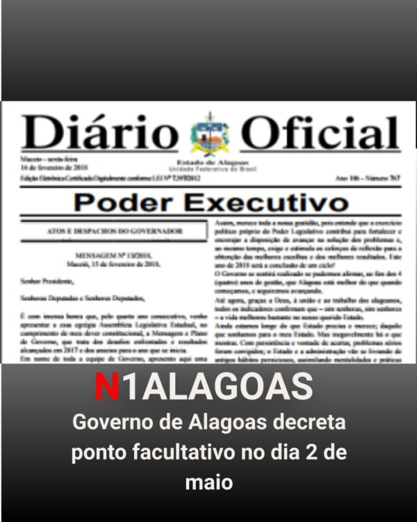 Byadminabril 30, 2025Foto: Ilustrativa O Governo de Alagoas decretou ponto facultativo para a próxima sexta-feira, 2 de maio, conforme o Decreto nº 100.540, de 27...