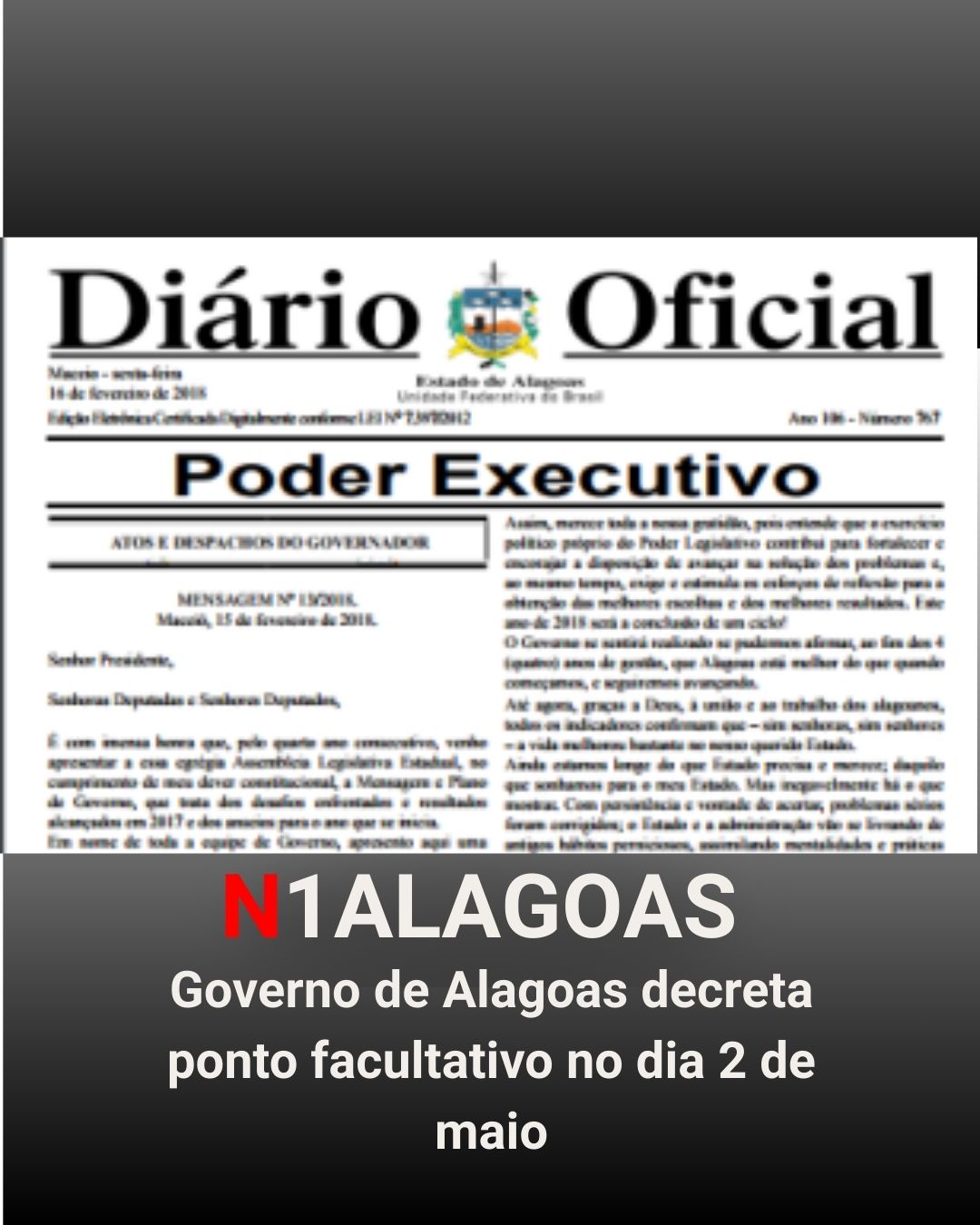 O Governo de Alagoas decretou ponto facultativo para a próxima sexta-feira, 2 de maio, conforme o Decreto nº 100.540, de 27 de dezembro de 2024. A medida foi publicada no suplemento do Diário Oficial do Estado em 20 de dezembro do mesmo ano e integra o calendário oficial de feriados nacionais, estaduais e pontos facultativos da administração pública estadual.