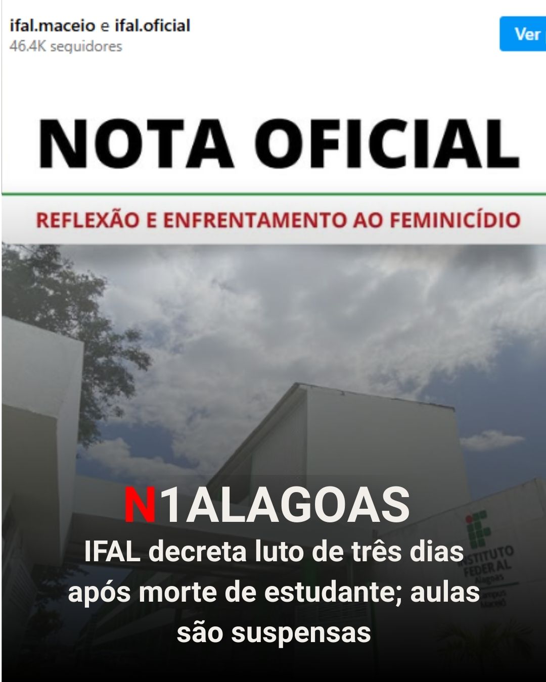Em nota divulgada nas redes sociais, o IFAL lamentou profundamente a perda e cobrou celeridade das autoridades na apuração do caso. A instituição também informou que promoverá ações de reflexão e repúdio à violência de gênero nesta terça-feira (6), em memória da estudante.