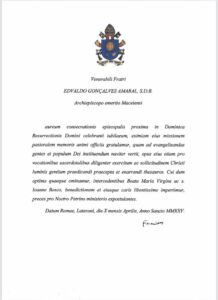 Em 10 de abril deste ano, poucos dias antes de seu falecimento, o Papa Francisco enviou uma carta ao Arcebispo emérito de Maceió, Dom Edvaldo Gonçalves Amaral, para marcar os 50 anos de sua ordenação episcopal, comemorados no domingo, 20 de abril. A data coincidiu com a última aparição pública do pontífice. A correspondência, escrita em latim, expressou o reconhecimento do Papa pela “excepcional missão pastoral” de Dom Edvaldo, destacando seu empenho na evangelização, na formação do povo de Deus e no incentivo à promoção de vocações sacerdotais.